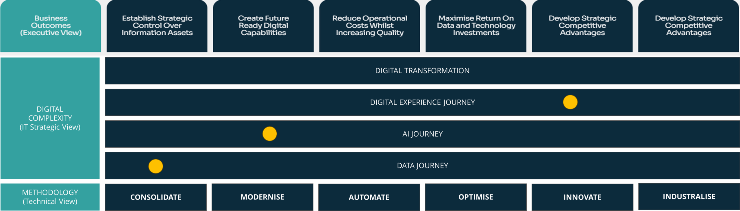 Our proven six-stage methodology bridges the gap between executive vision and technical implementation guiding organisations through a complete data and AI transformation journey, delivering measurable business impact at every step. We believe the IT complexity of DX, AI and Data requires simplification in order to drive effective transformation. Join up with our consultancy teams to establish your short, medium and long term transitions in order to enable your organisations business outcomes.